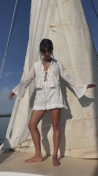 The silhouette is relaxed and softly cropped, finished with a gentle scalloped hem trimmed in fine lace. Long, subtly flared sleeves are balanced with lace-edged cuffs, adding movement and understated old-world femininity. At the front, a lace-up tie closure allows the blouse to be worn open or drawn in, offering an adjustable, easy fit.